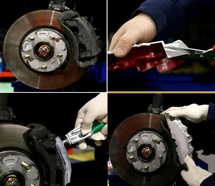 Apply high temperature resistant AB glue on the inner side of the caliper cover or the surface of the caliper, so that the caliper cover can be in close contact with the caliper, corresponding to the position of good contact and then the high temperature resistant AB glue, and the AB glue solidification time needs three Four hours, please wait for the AB glue to solidify before starting your car, thank you! (excluding silicone)