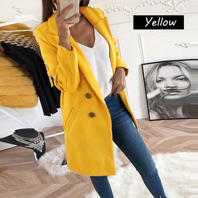 Women Solid Woollen Coat Autumn Winter Fashion Long Sleeve Lapel Neck Pockets Jackets Female Plus Size Long Slim Button Outwear